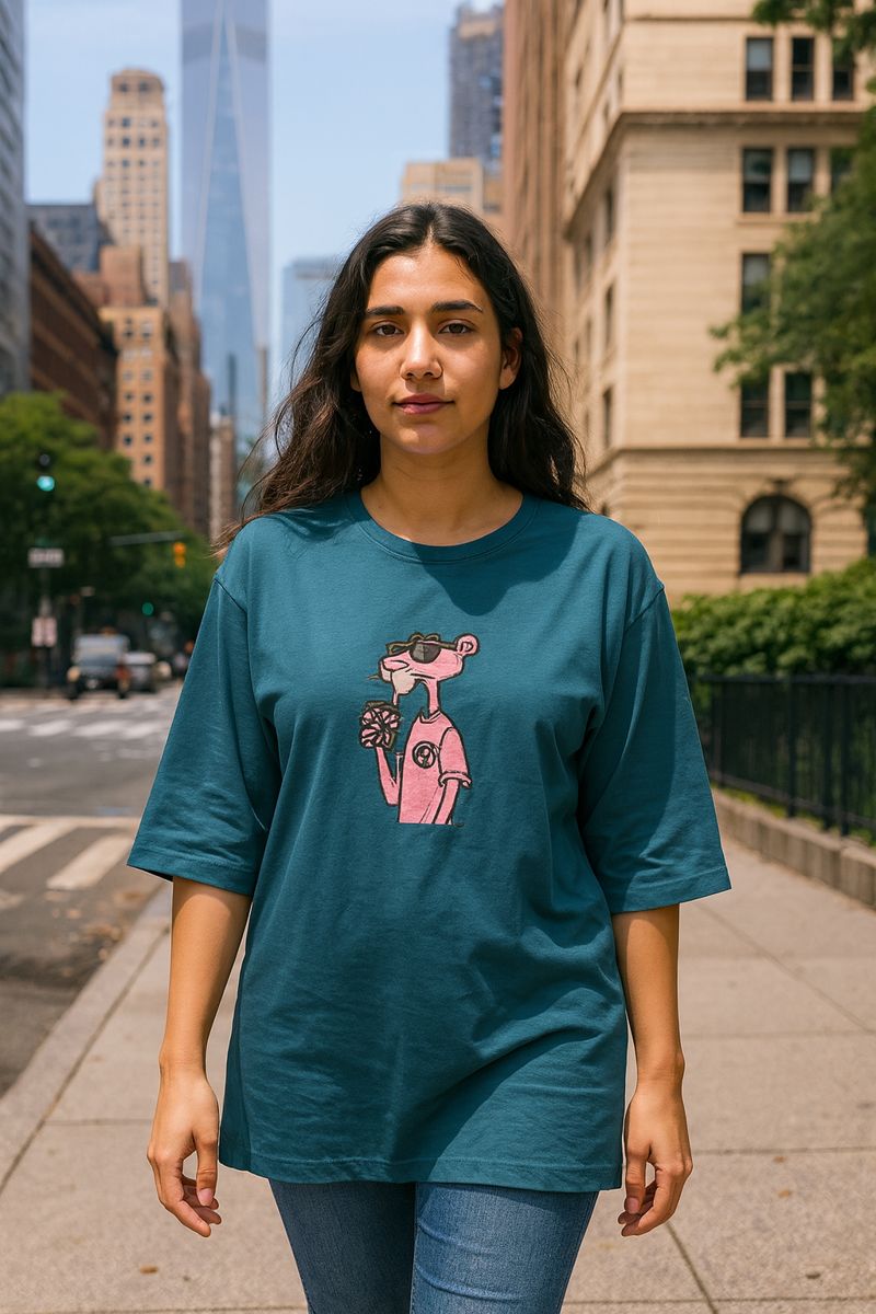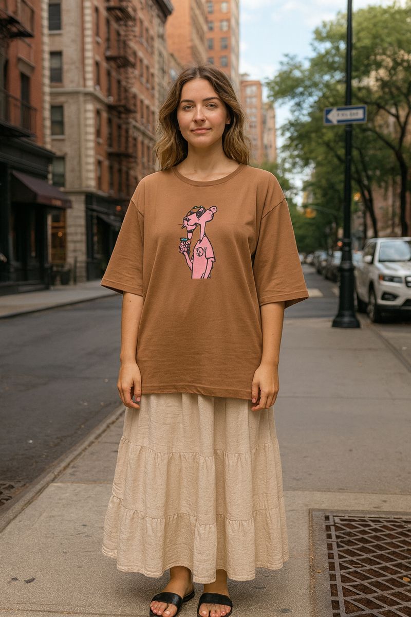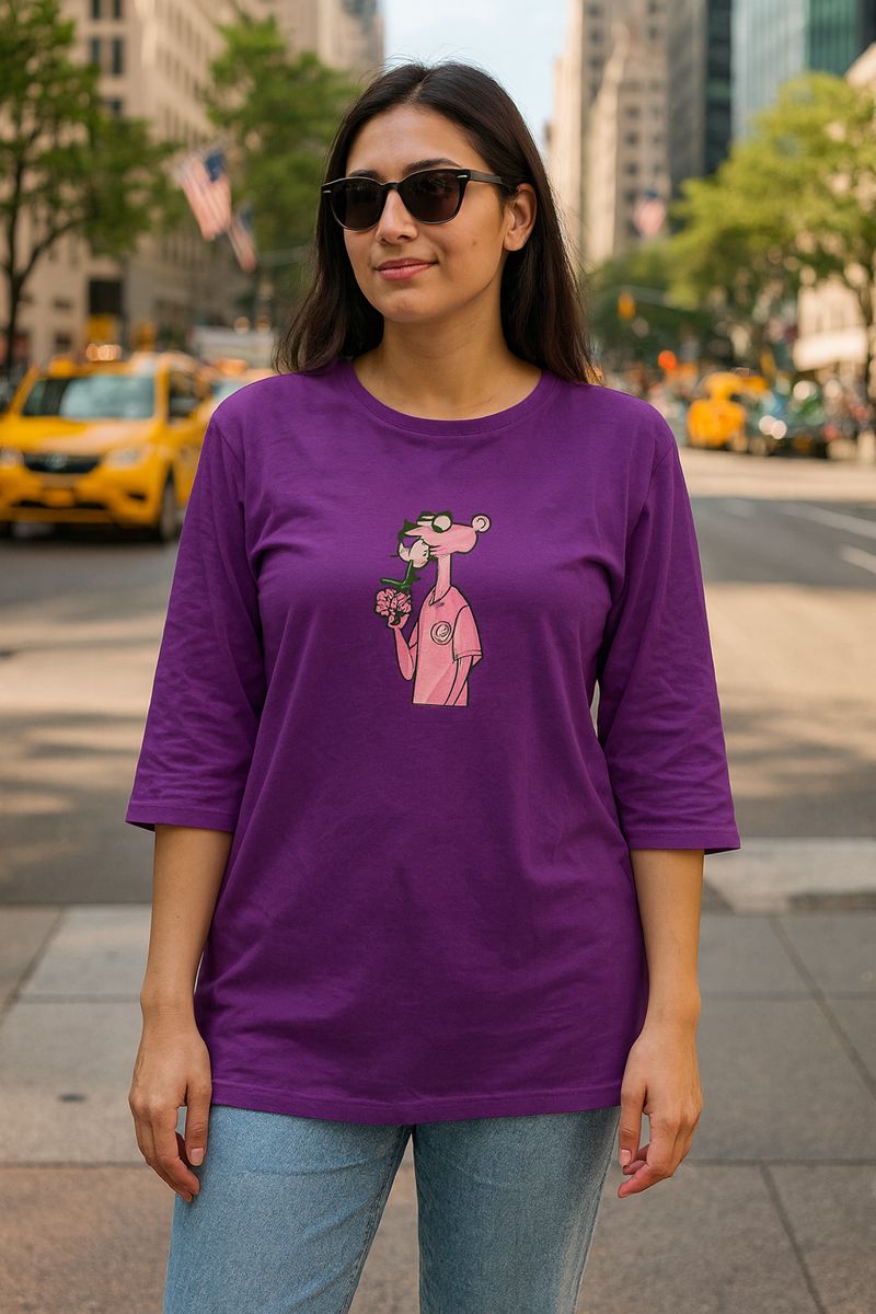 تیشرت لانگ زنانه طرح پلنگ صورتی جنس نخ پنبه سوپر آستین سه ربع فری سایز 38 تا 48