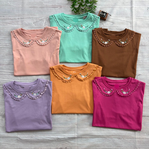 تیشرت یقه نساجی گلدوزی زنانه جنس نخ پنبه فری سایز 36 تا 42